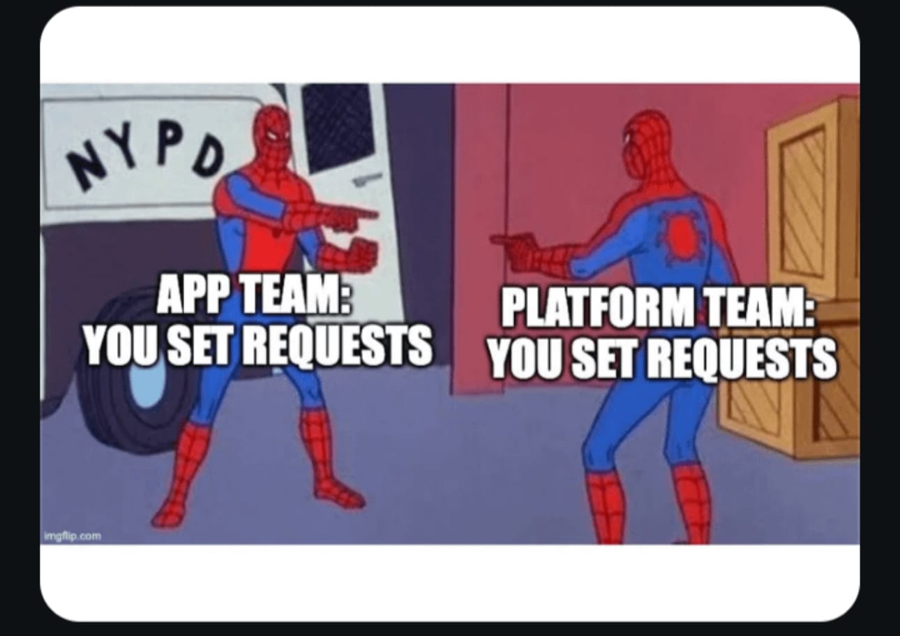 개발팀이랑 플랫폼팀 중 누가 쿠버네티스 Request 를 설정할지를 두고 싸우는 모습인데