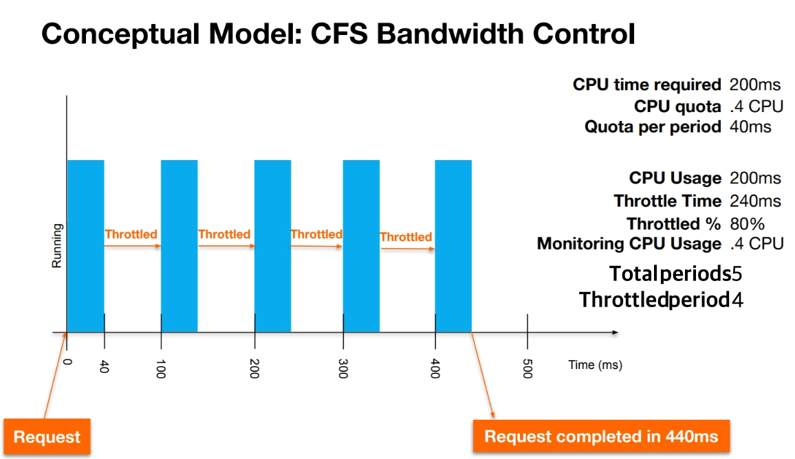 따라서 CPU Limit 0.4 인 파드가 200ms 의 요청을 처리하기 위해서는